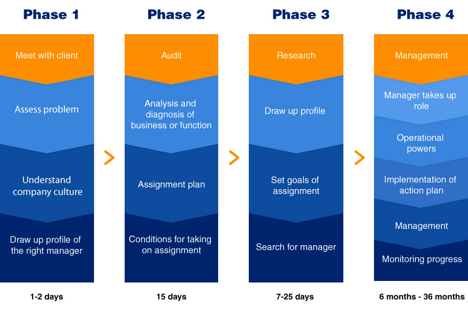 This is the phase which most distinctly characterizes the temporary management approach. It is when the interim manager takes up his/her designated role in the company. He/she is introduced to the team and, having received the necessary powers, starts to work.